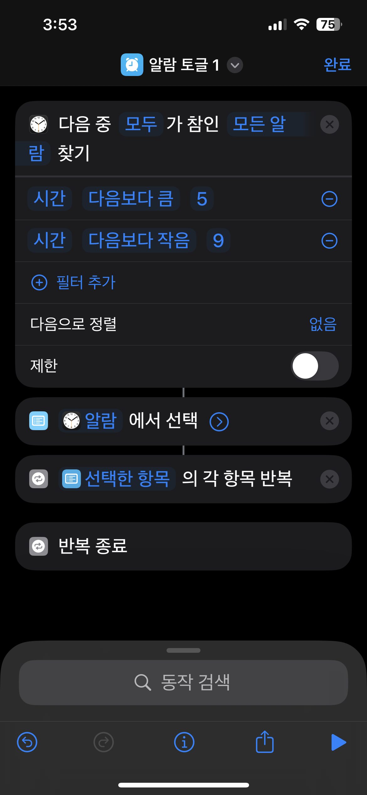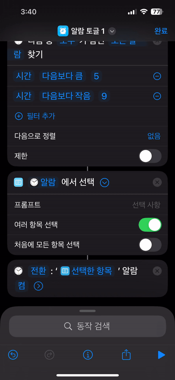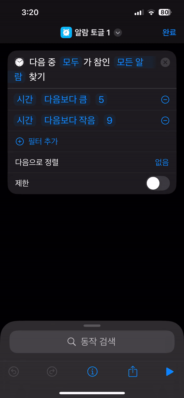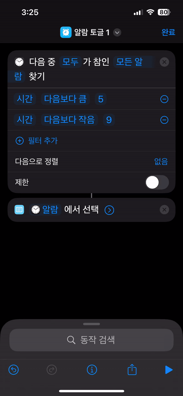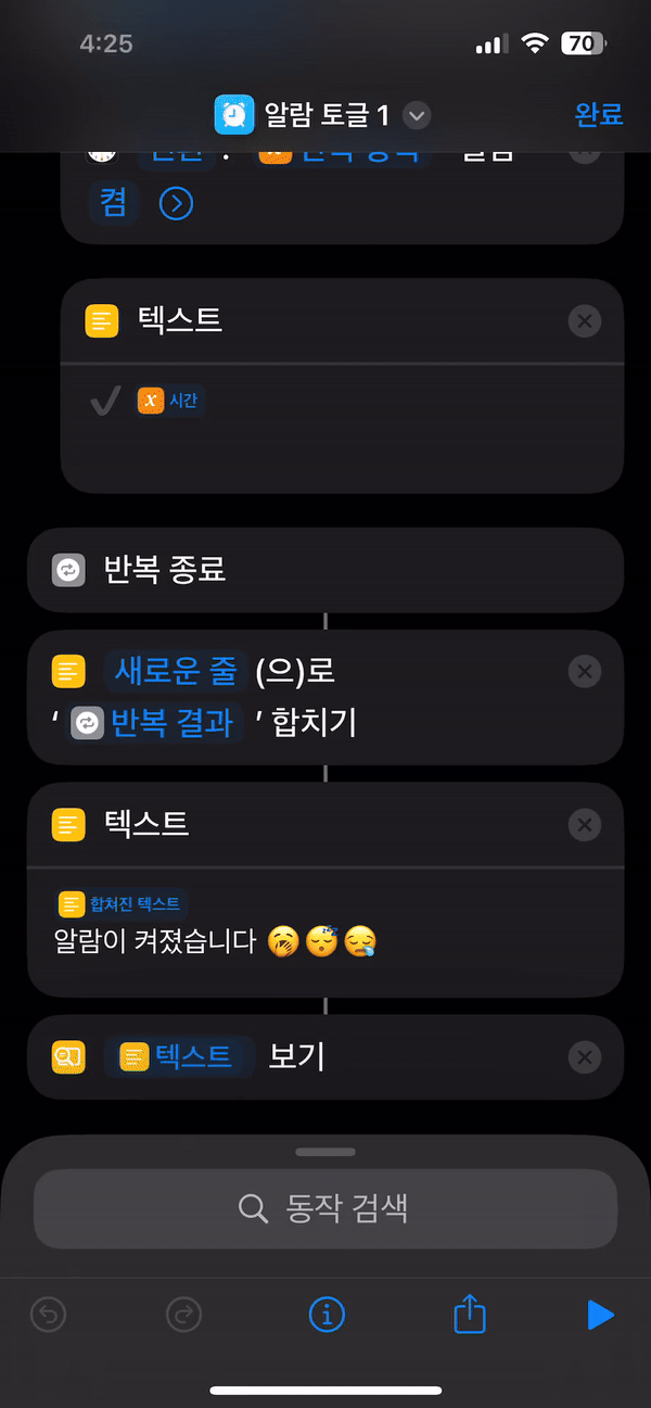 이렇게 생성한 단축어를 매일 자기 전 실행하여 다음날의 기상 시간을 설정하고 싶습니다.