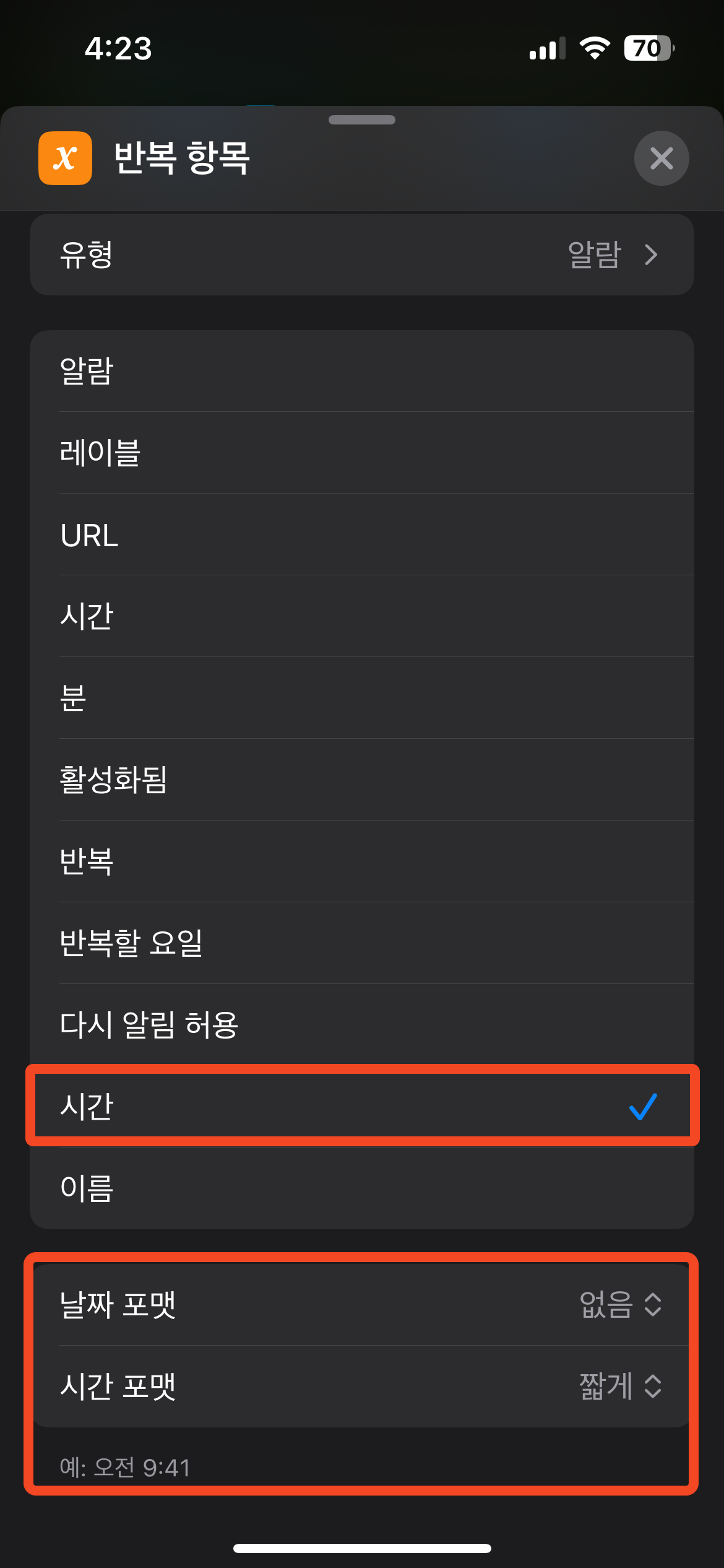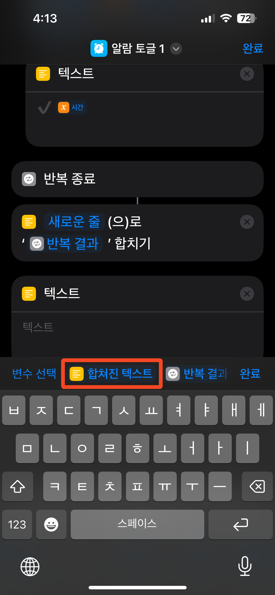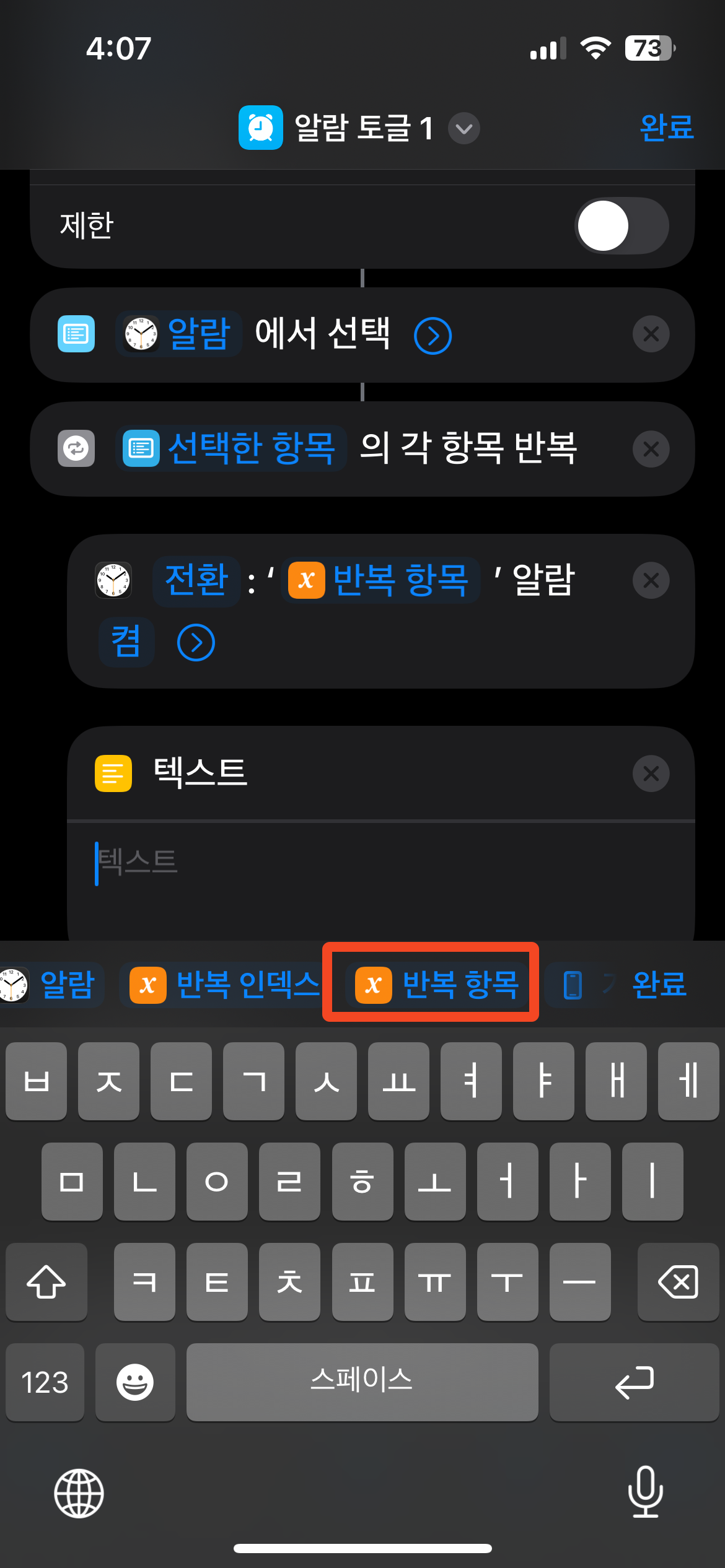 다시 알람 토글을 추가해주는데, 들어갈 위치는 사진과 같이 선택한 항목의 각 항목 반복