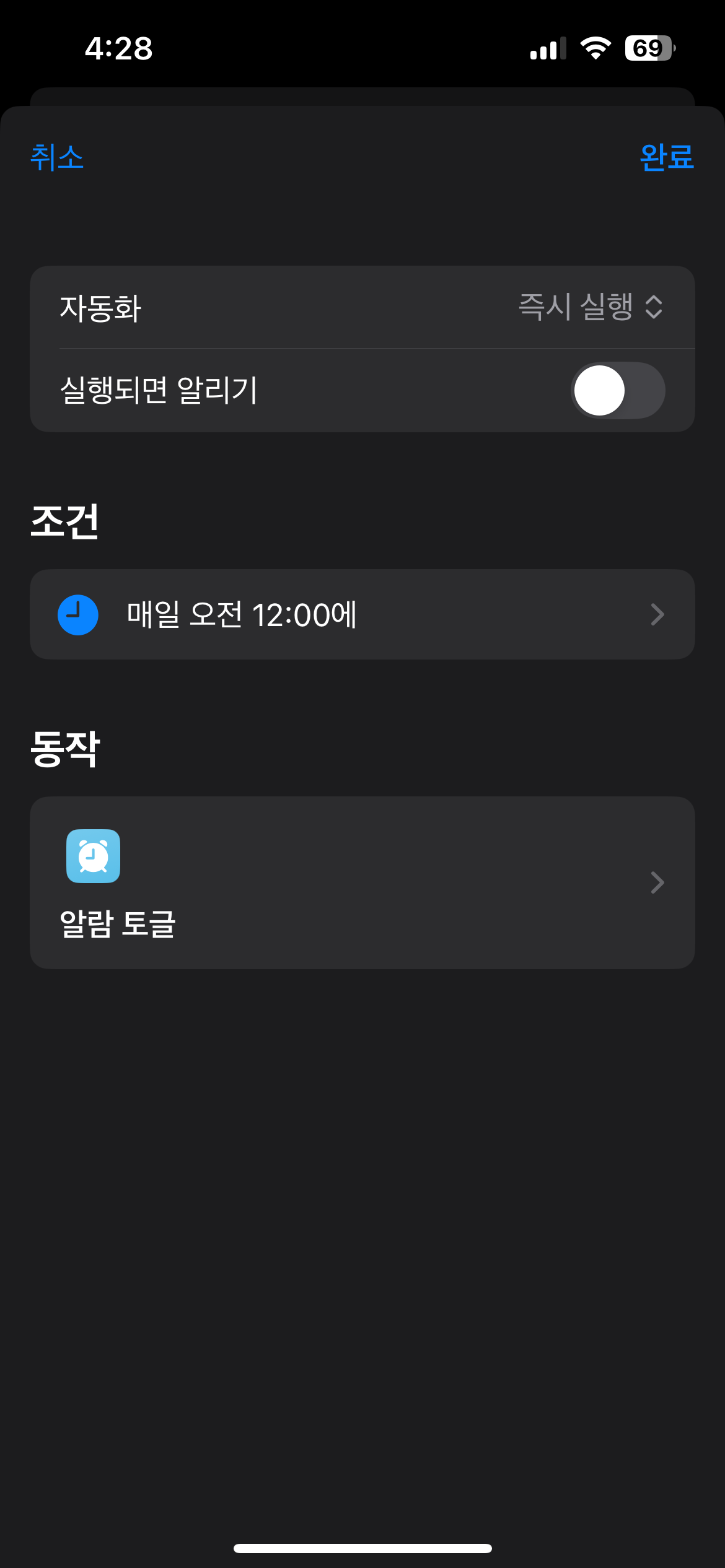 자동화를 통해 매일 오전 12시에 자동으로 실행하여 원하는 시간의 알람을 편리하게 켤 수 있습니다. 🤩🤩
