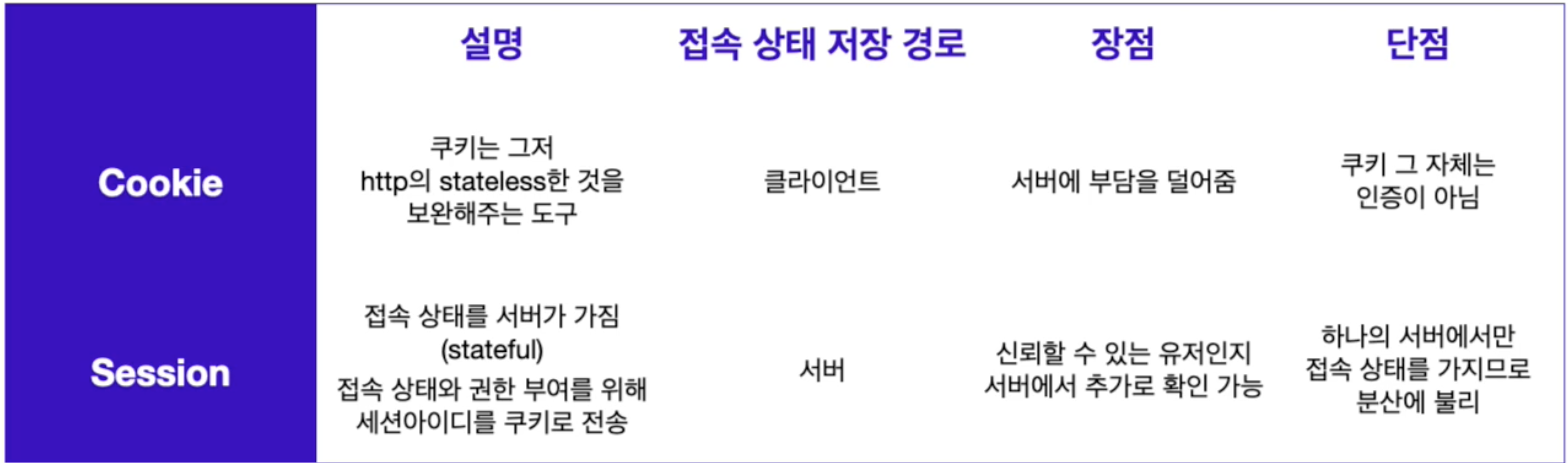 로그인상태 유지, 각종 configulations 등을 저장해놓음. 하지만 기본적으로는 쿠키는 오랜 시간 동안 유지될 수 있고, 자바스크립트를 이용해서 쿠키에 접근할 수 있기 때문에 쿠키에 민감한 정보를 담지 말자.