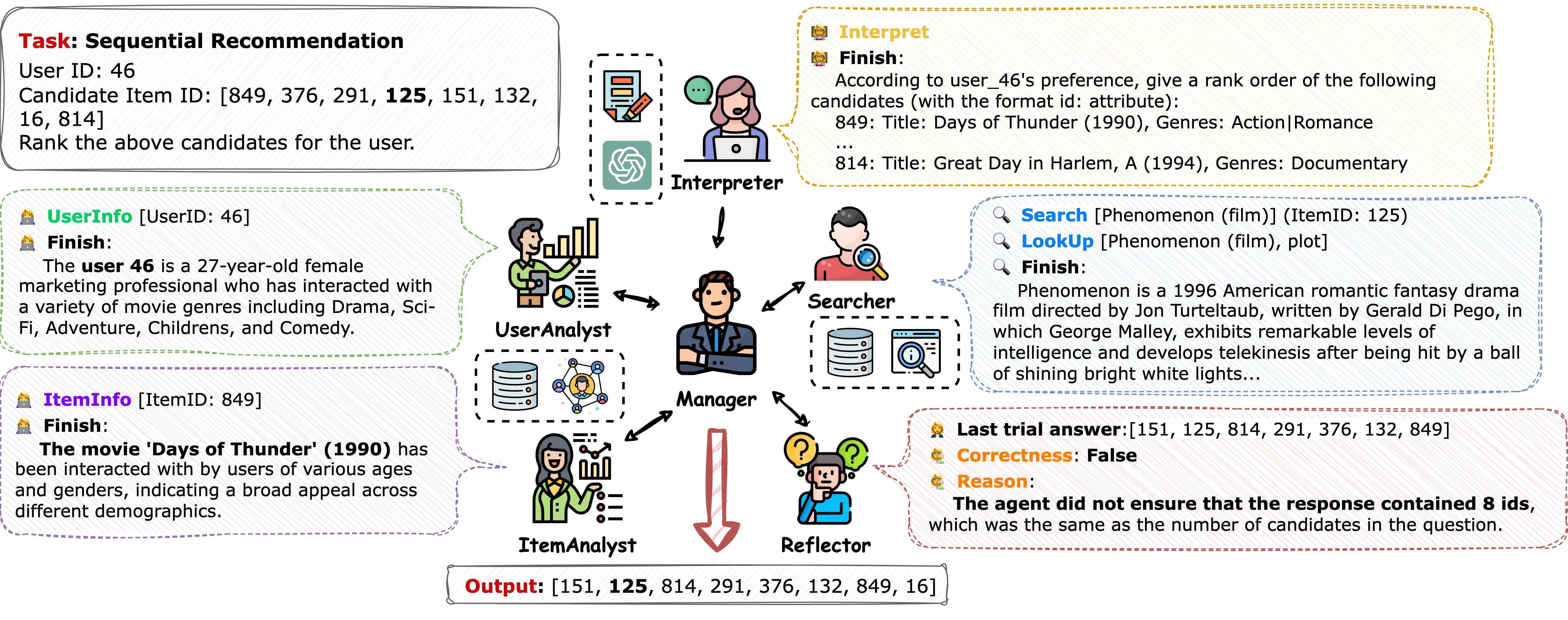 The Framework of MACRec. We take a sequential recommendation task as an example to show how these agents work collaboratively.