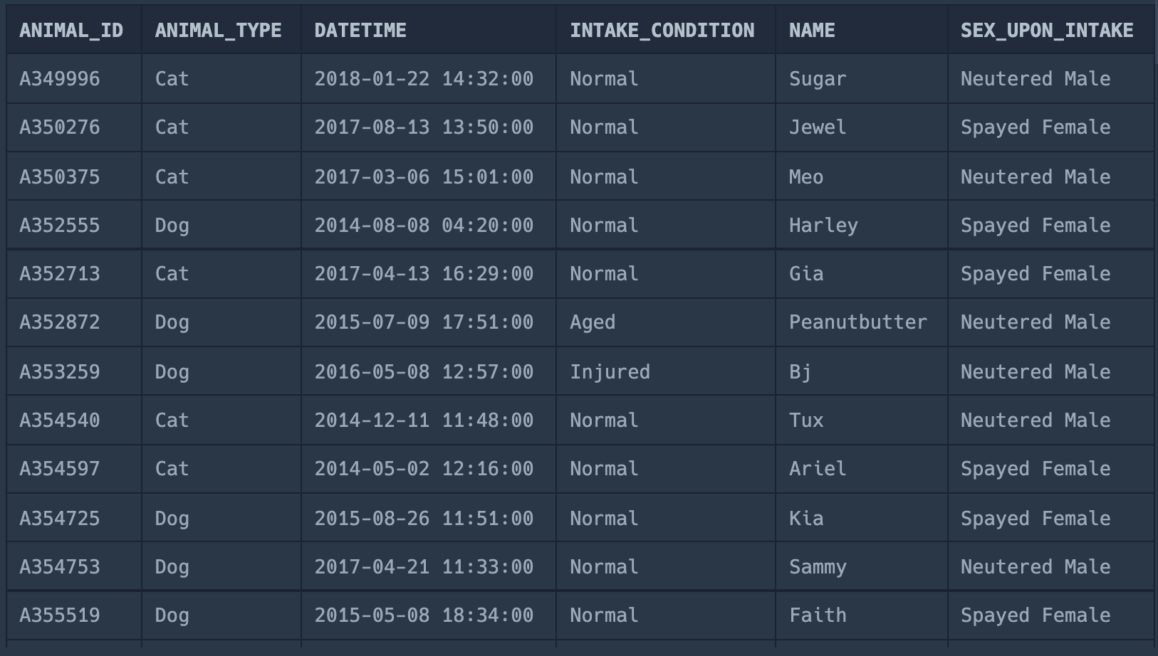 SELECT * FROM ANIMAL_INS