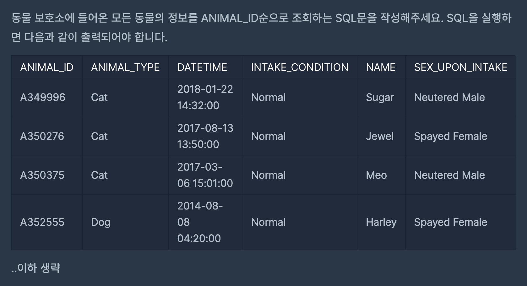 모든 동물의 정보를 출력해야 하므로 SELECT *를 씁니다. 동물보호소에 들어온 모든 동물의 정보를 가진 테이블 ANIMAL_INS로 부터 데이터를 가져 올 것이기 떄문에 FROM ANIMAL_INS를 작성합니다. 이제 나타난 표를 ANIMAL_ID의 순서 즉, 오름차순으로 정렬하므로 ASC(Ascending의 약자)은 생략 가능하여 ORDER BY ANIMAL_ID로 마무리 합니다.