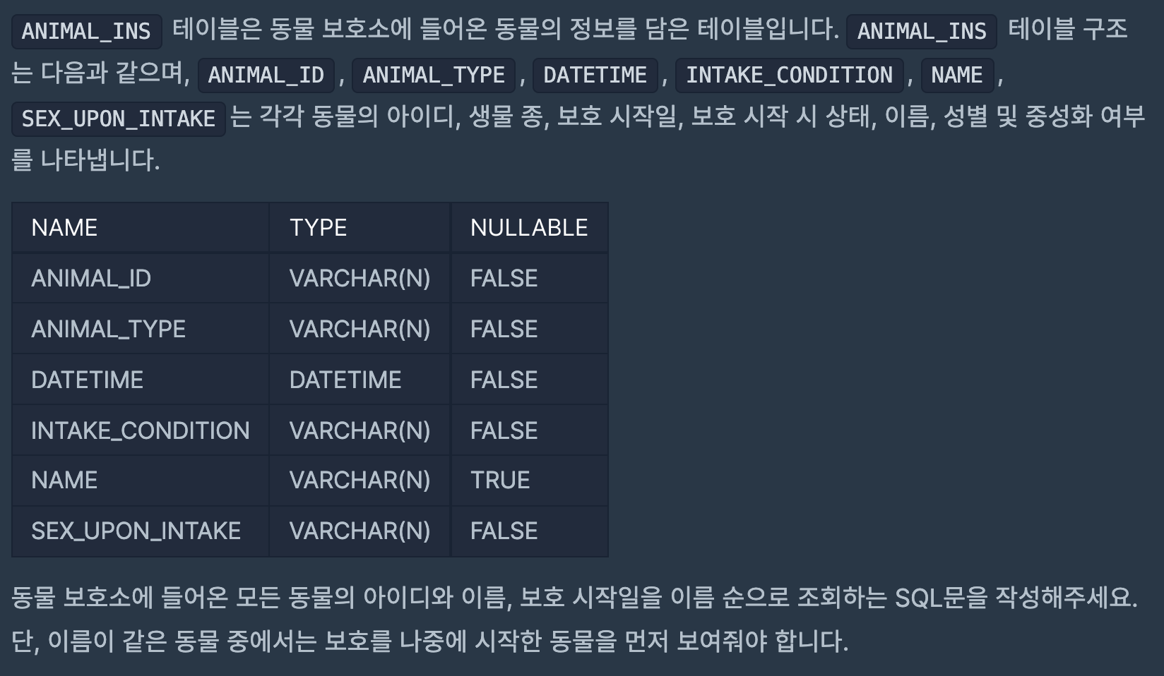 우선 예시 테이블의 칼럼과 같은 결과를 내기 위해 SELECT ANIMAL_ID, NAME, DATETIME 을 씁니다. 다음은 동물 보호소의 동물 정보 테이블 ANIMAL_INS에서 데이터를 가져오기 위해 FROM ANIMAL_INS 를 작성합니다. 이제 가장 중요한 정렬 부분으로 우선 이름 순으로 정렬을 하고 그중 같은 이름만 다른 정렬을 해야 하므로 NAME을 앞에 적는다. ORDER BY NAME ASC, DATETIME DESC 로 마무리를 합니다. 원래대로라면 ASC를 생략하나, 뒤에 나올 DATETIME의 내림차순과 같이 쓰일 수가 있기 때문에 ASC를 생략하지 않았습니다.