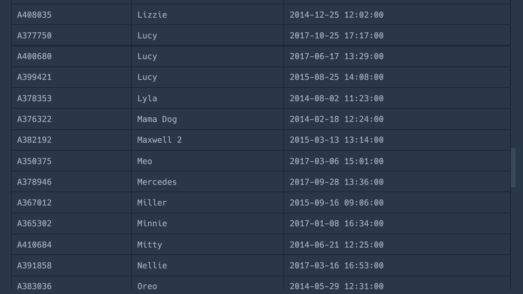 실행결과 두번째 이미지의 위에서 두번째 같은 이름 'Lucy'가 세번 나옵니다. 이 때 보호 시작일(DATETIME)은 내림차순으로 정렬된 것을 볼 수 있습니다.
