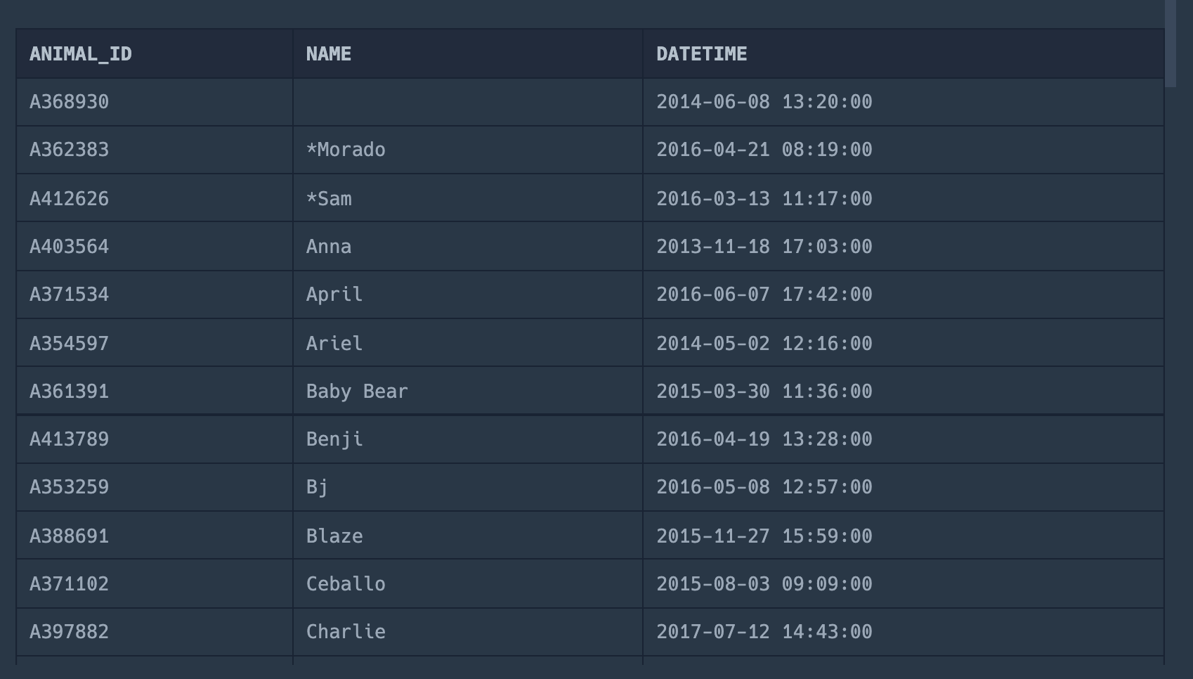 SELECT ANIMAL_ID, NAME, DATETIME