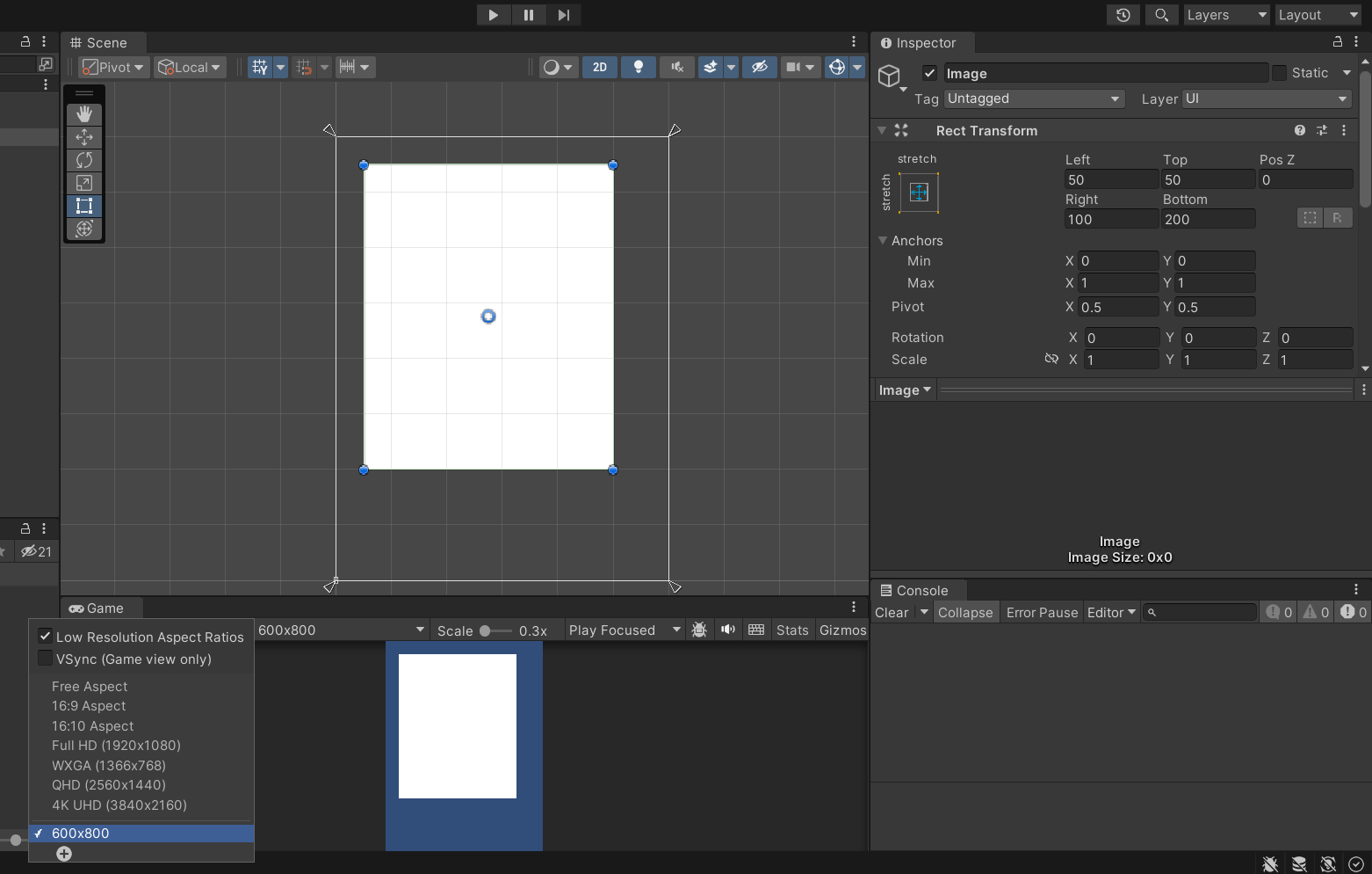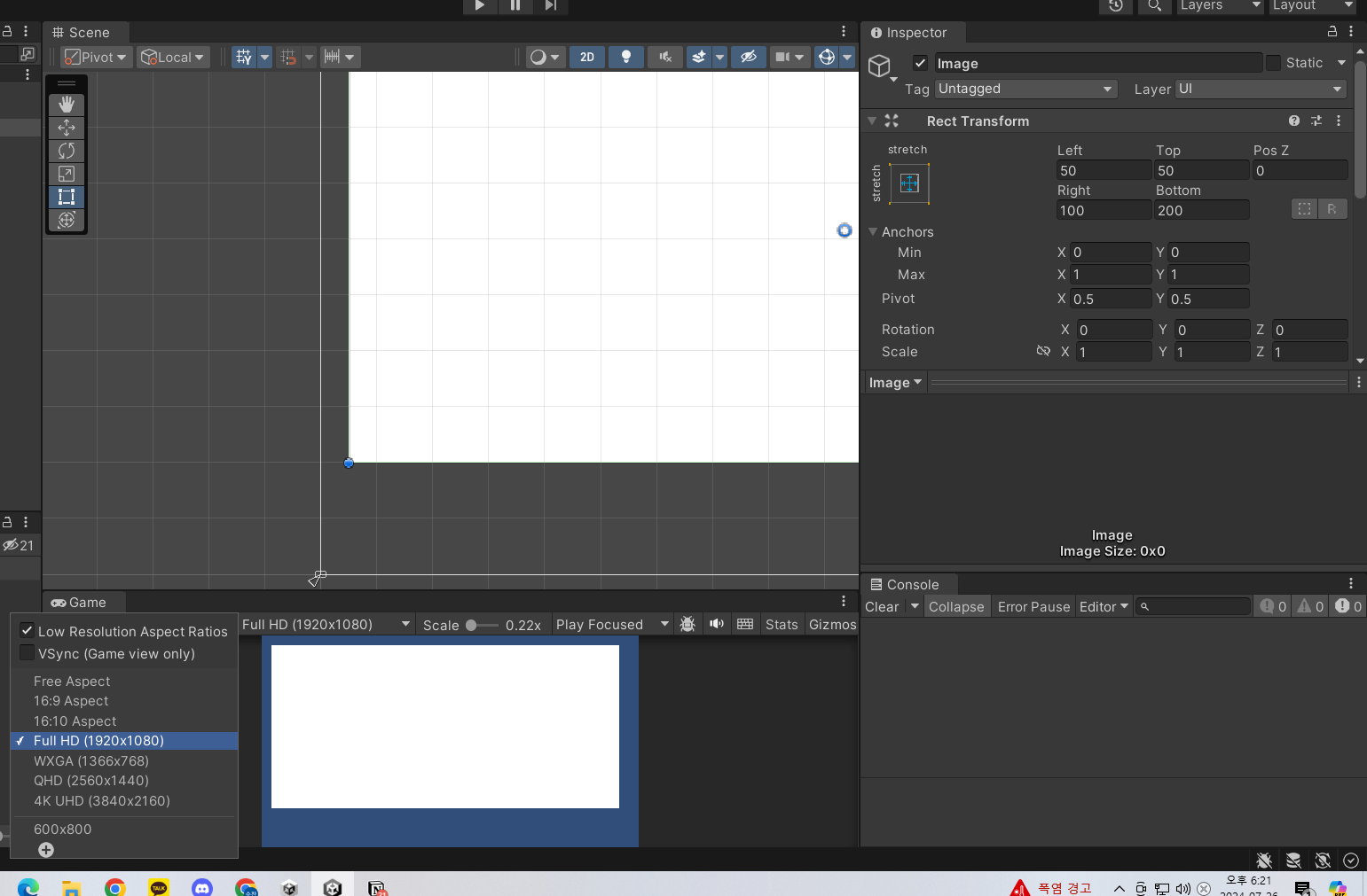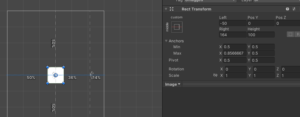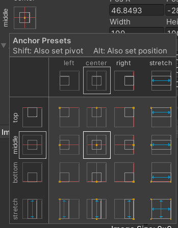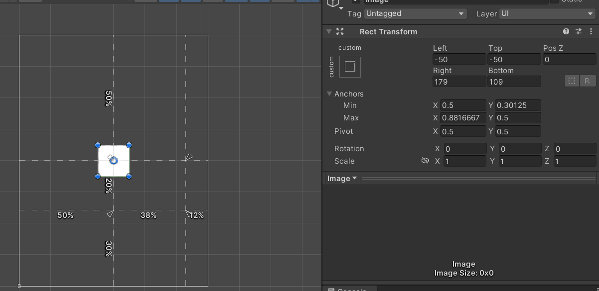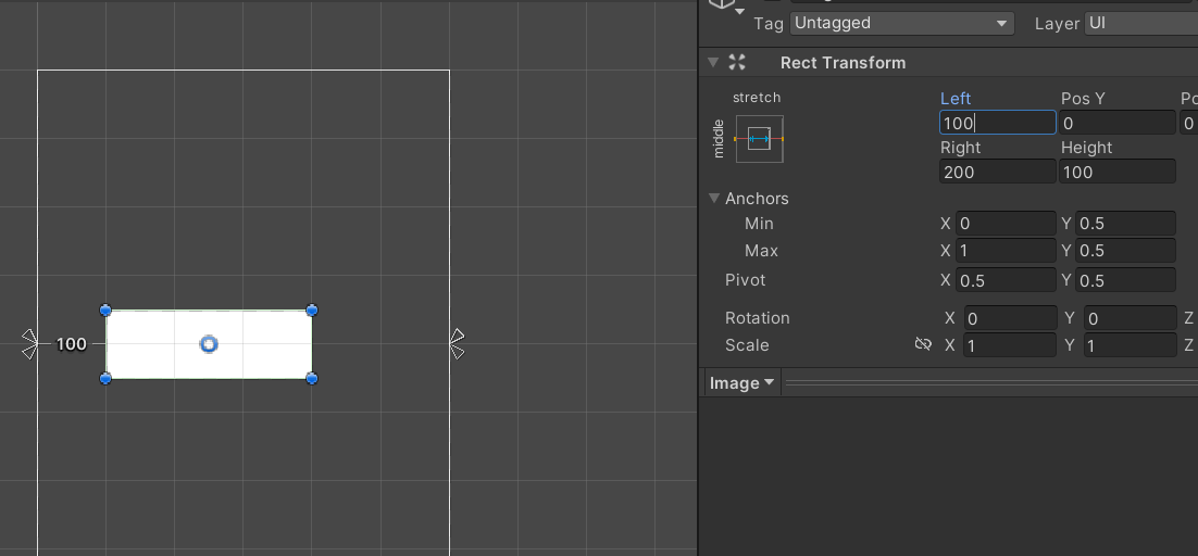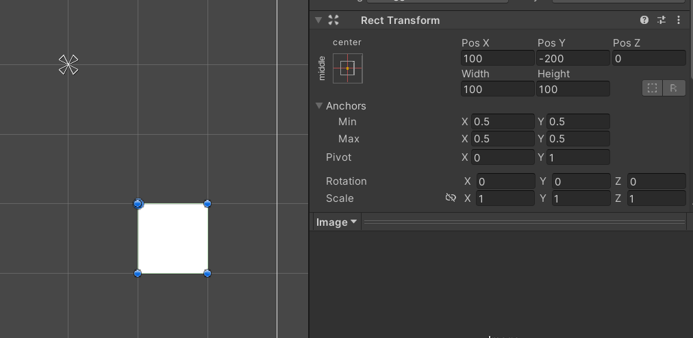 로 잡으니 왼쪽위 꼭지점이 오브젝트의 기준점이 되는 모습. 큰 의미가 있나 싶은 앵커와 피봇에 대한 개념을 확실하게 이해해야하는 이유는 유니티 개발을 하면서 백날천날 건드리는 position 값을 결정하기 때문이다.