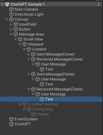 var item = Instantiate(message.Role == "user" ? sent : received, scroll.content);// ✅ 추가한 내용 !! if (message.Role != "user") { GetComponent<TexttoSpeech>().readingEng = item.GetChild(0).GetChild(0).GetComponent<Text>(); GetComponent<TexttoSpeech>().EngBtn(); }