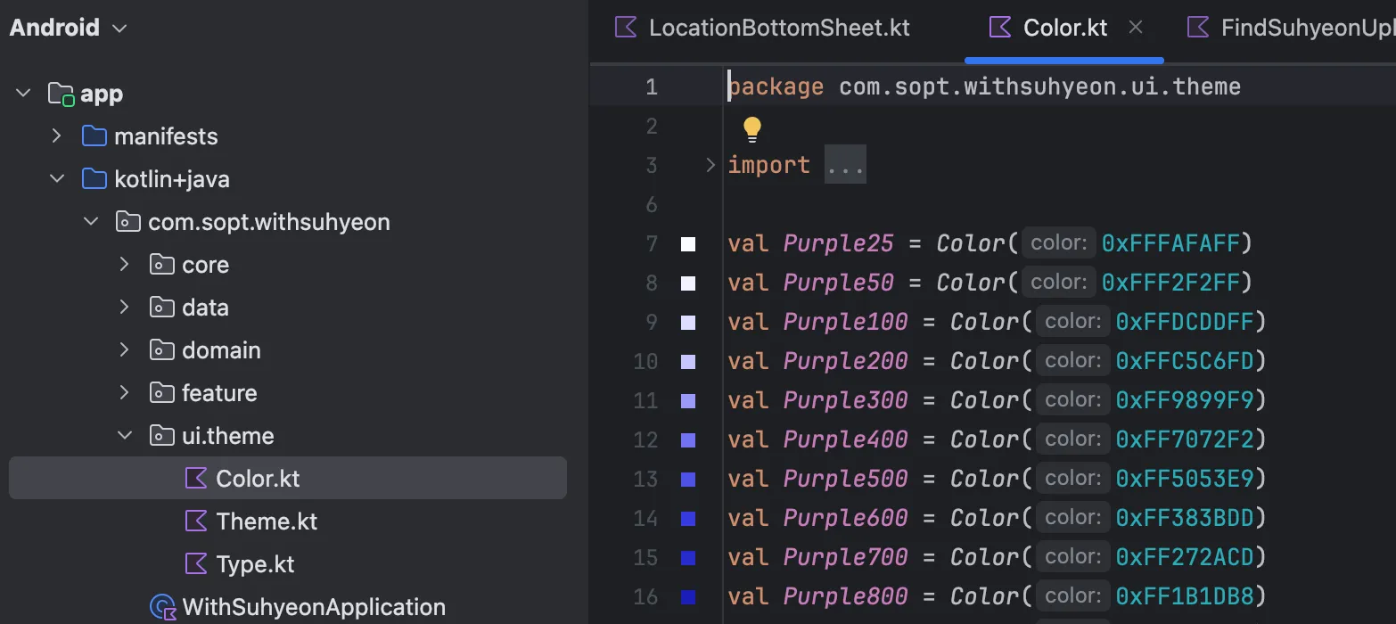 컴포즈에서는 파일 생성할 때 생긴 ui.theme > Color.kt 파일에서 넣어주면 된다.
