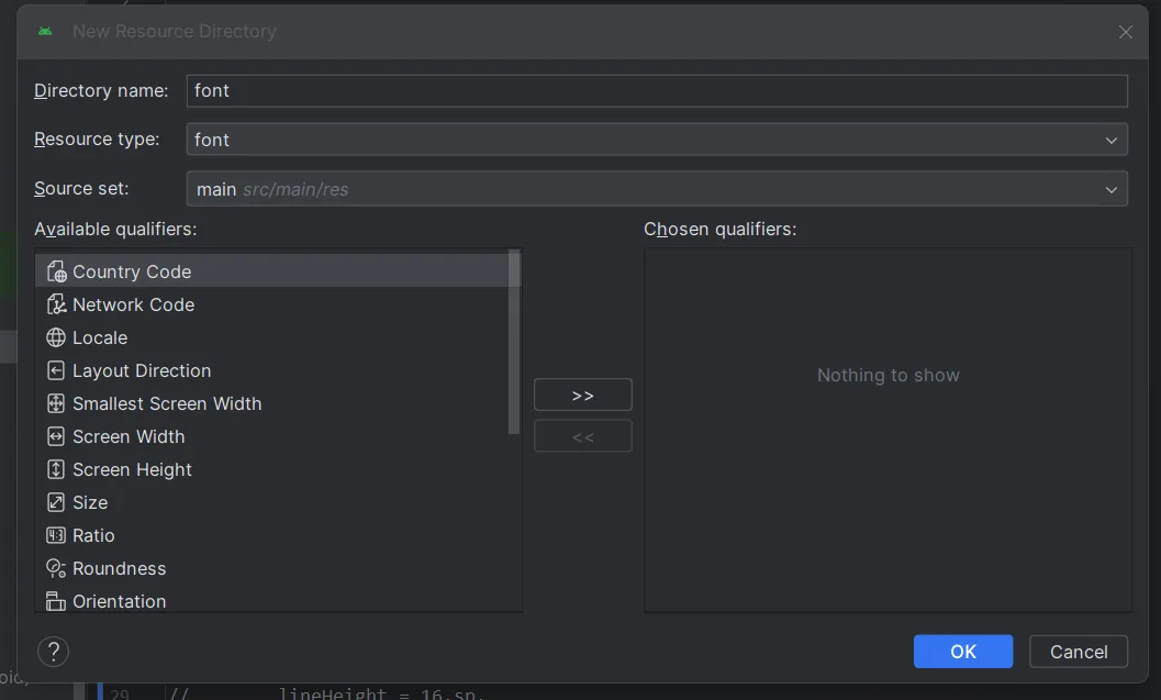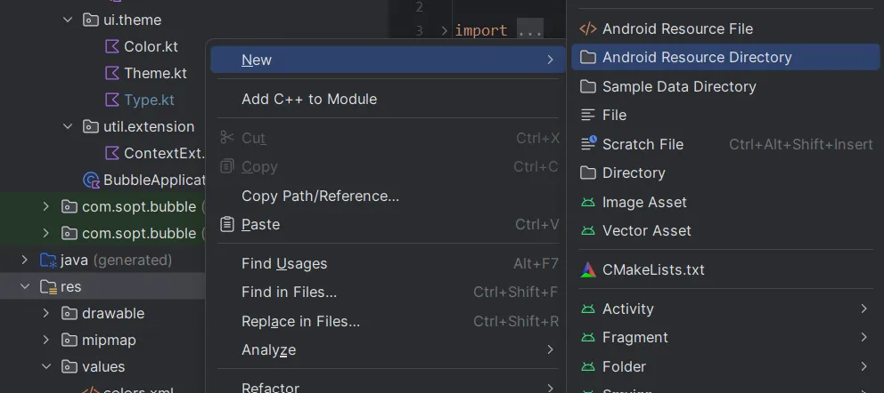 폰트의 경우 res > New > Android Resource Directory 파일을 열어준다.
