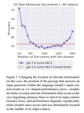 실제로 U자형 곡선을 그리며 관련된 문서가 중간에 위치했을때는 오히려 관련된 문서를 제공하지 않은 것보다 성능이 더 좋지 않았음.