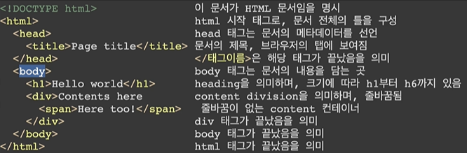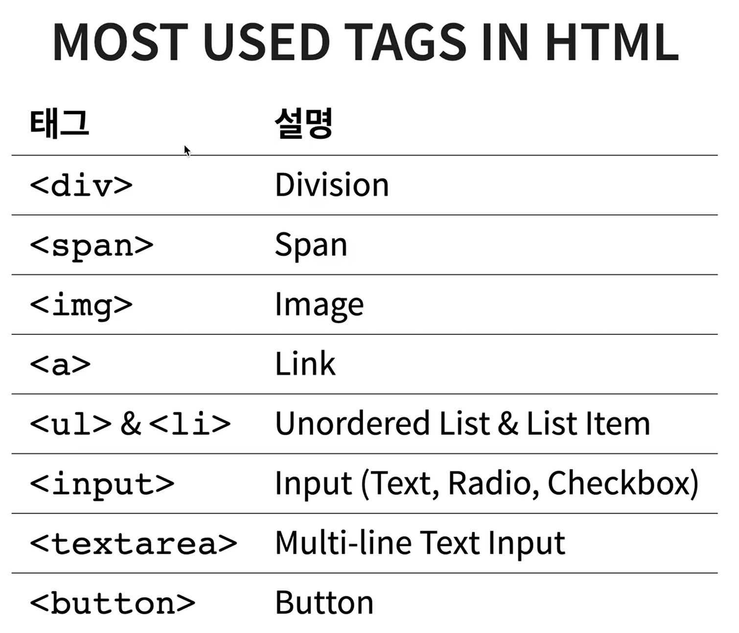Tag : 부등호 (< >)로 묶인 HTML의 기본 구성 요소