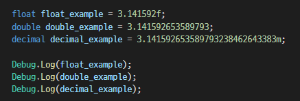 이 세 부동소수점 자료형의 처리 속도는 유의미할정도로 크기 때문에 게임개발에는 주로 float를 활용하는데 decimal은 경제, 금융 등 신뢰성이 필요할 때 주로 사용한다.