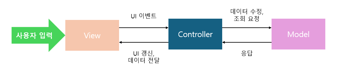 이를 통해 MVC패턴의 관심사 분리가 이루어진다. Controller는 사용자 입력을 받아 이를 처리하고, Model은 데이터 처리를 View는 화면 갱신만 담당한다.