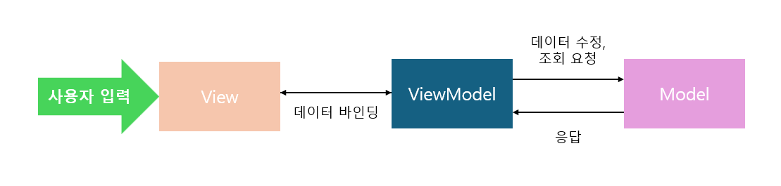 ViewModel : View와 Model 사이의 중재자 역할을 하지만 ViewModel과 View는 데이터바인딩으로 연결되어있다. 데이터바인딩은 UI가 아닌 개체의 속성과 UI 요소간 동기화를 보장하는데 바인딩을 활용하여 두 요소 간의 상호작용을 간소화하며, 각 UI 업데이트에 대해 수동으로 이벤트 핸들러를 작성할 필요가 없어진다.