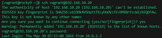 [vagrant@server1 ~]$ ssh ssh-user@192.168.10.20