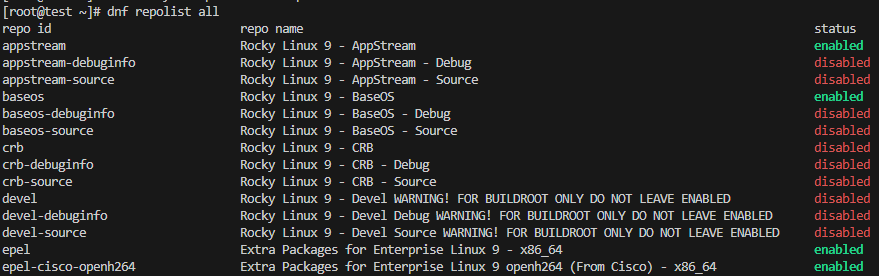 옵션에 따라 설치되어 있거나 설치할 수 있는 모든 repository를 조회할 수 있다.