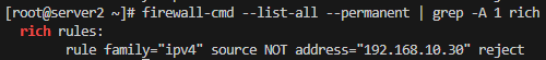 firewall-cmd --permanent --add-rich-rule="rule family="ipv4" source not address="192.168.10.30" reject"