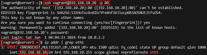ip가 192.168.10.20로 설정된 server2로 ssh 접속하면 192.168.10.10 ip를 가진 server1로 redirection 되도록 port forwarding