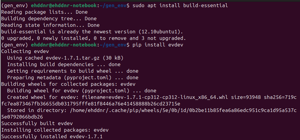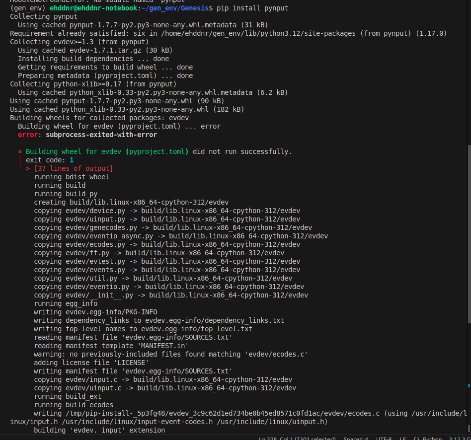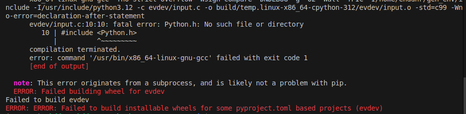 이 에러는 evdev 패키지를 빌드하는 과정에서 Python C 헤더 파일이 없어서 발생합니다. 이 문제를 해결하려면 Python의 개발 헤더 파일과 관련 도구를 설치해야 합니다.