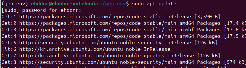먼저 가상환경이 실행되고 있고, sudo apt update를 했습니다.