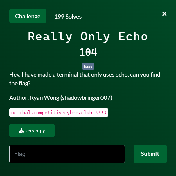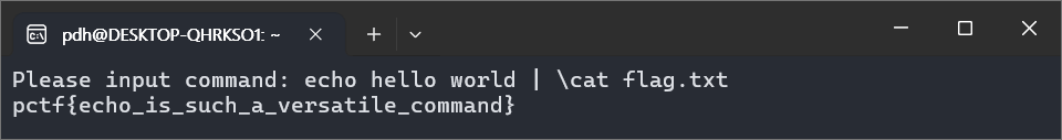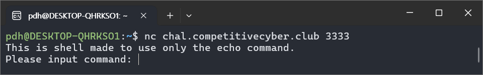 2024년 9월 21일부터 진행된 PatriotCTF의 misc 분야로 출제된 문제였다. 문제 내용을 번역하자면 '안녕하세요, echo만 사용하는 터미널을 만들었는데, flag를 찾을 수 있나요?' 라는 내용이었다.
