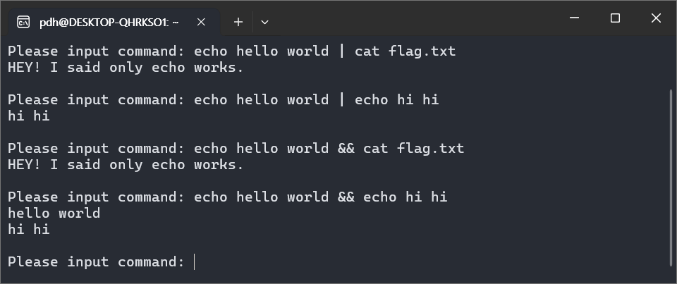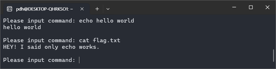 실제로 echo 명령어는 잘 실행되지만 다른 명령어를 사용하면 'HEY! I said only echo works.' 라는 문자열을 출력하고 명령어를 실행하지 않는다.