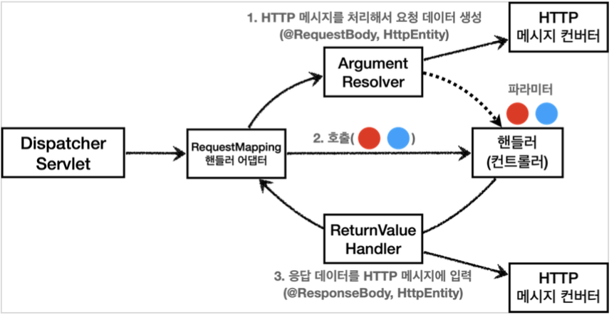 - 컨트롤러를 호출할 때에는 request, response의 값, @RequestParam의 파라미터, inputstream등 어디선가 이들에게 데이터를 던져주고 있다. 이건 무엇일까? 바로 Argument Resolver이다. 핸들러 어댑터가 컨트롤러를 호출하기 전에 Argument Resolver를 호출하고 컨트롤러에서 핸들러 어댑터로 반환하기 전에 ReturnValueHandler가 호출되는 것을 볼 수 있다. 핸들러 어댑터가 핸들러(컨트롤러)를 보고 빨간색, 파란색 파라미터가 필요한 것을 확인하면 Argument Resolver에게 물어본다. 그러면 Argument Resolver가 파라미터 2개를 생성해준다. 그때 핸들러 어댑터가 핸들러(컨트롤러)를 호출하면서 Argument Resolver를 통해 생성된 파라미터를 넣어준다.