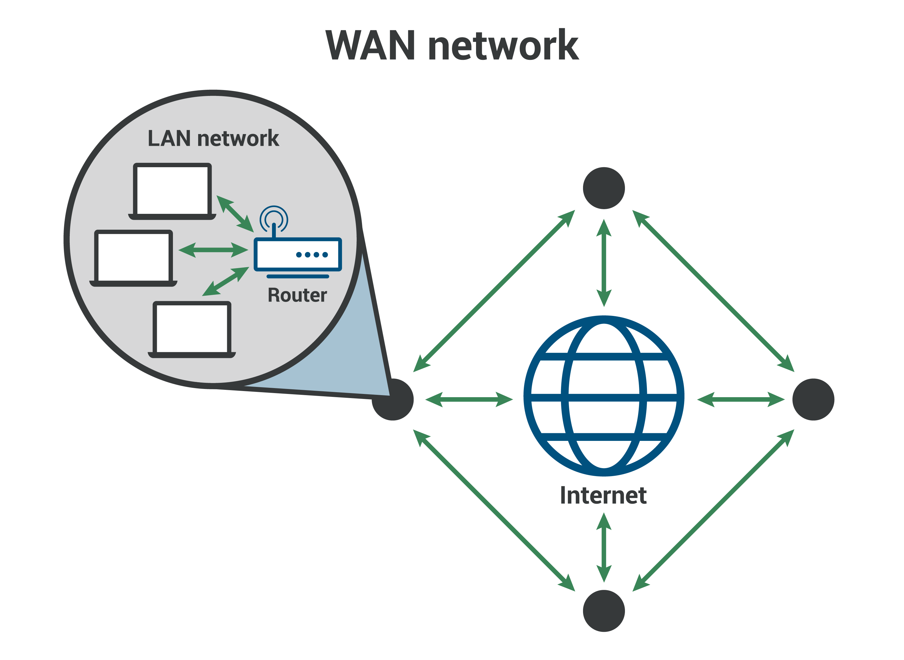 WAN은 먼 거리에 있는 컴퓨터 그룹을 연결하는 대규모 컴퓨터 network 이다. WAN은 기업에서 사무실 network를 연결하는 데 자주 사용한다. 각 사무실에는 일반적으로 자체 LAN이 있으며, 이러한 LAN은 WAN을 통해 연결된다. 이러한 긴 연결은 임대 회선,VPN,IP 터널 등 여러 방법으로 형성될 수 있다.
