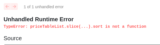 혹시 몰라서 debugger가 실행 중일때 콘솔에서 typeOf로 'priceTableList'의 타입을 체크해보니 string타입으로 출력되었다; json데이터가 parsing될 때 설정을 해주지 않은것 같아서 'priceTableList'를 사용하는 부분에 JSON.parse(priceTableList).slice().sort()코드를 그대로 사용했더니 아까와 같은 에러가 뜨지 않았다. 이전버전의 axios는 parsing된 데이터의 타입을 정의하지 않아도 무조건 json에서 자동으로 변환해주었던것이 이제는 명시해줘야 한다는 변경이 있었고 axios.confing 파일에서 수정해 주었다.