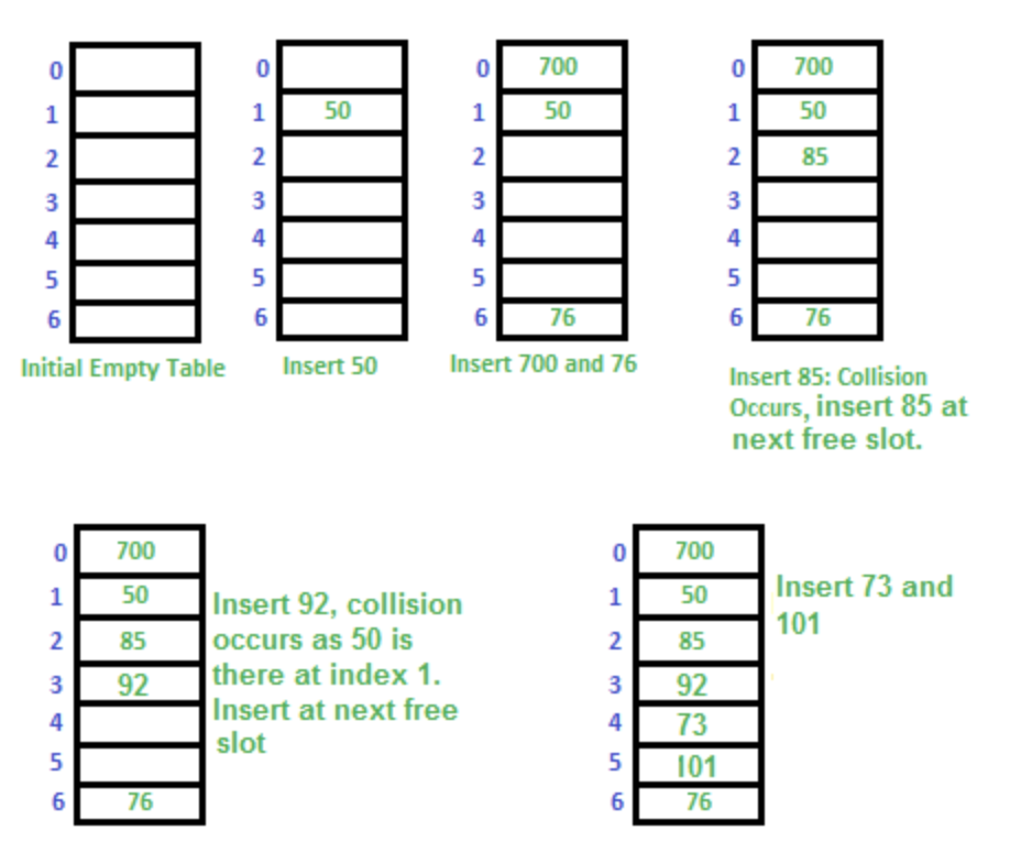 이렇게 오픈 어드레싱 방식은 비어있는 다른 bucket을 찾아서 비어있는 bucket에 저장하는 방식이다.