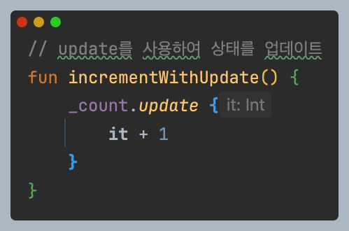 안드로이드에서 흔히 MutableStateFlow의 상태값을 변경할 때 setValue 혹은 update 함수를 통해 상태값을 변경한다.