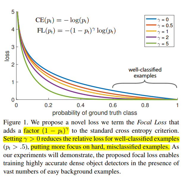 예시로 만약 한 example이 잘못 분류되어 가 작다면 modulating gactor가 1에 근사하여 loss는 영향받지 않을것이다. 하지만 가 1에 가까울수록 factor는 0에 가까워지고 잘 분류되는 example들은 down-weighted 될 것이다. focusing parameter인 는 easy example들이 down-weighted 되는 비율을 조정한다.