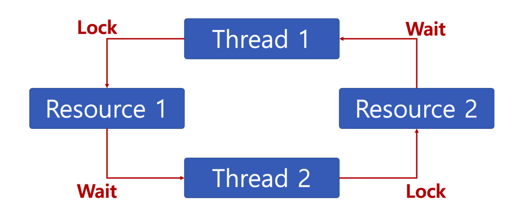 - ์ํ๋๊ธฐ(Circular wait): ๊ฐ ํ๋ก์ธ์ค๋ ์ํ์ ์ผ๋ก ๋ค์ ํ๋ก์ธ์ค๊ฐ ์๊ตฌํ๋ ์์์ ๊ฐ์ง๊ณ ์๋ค.