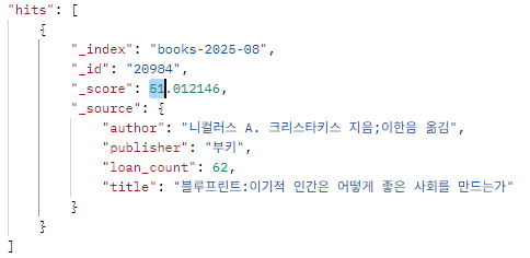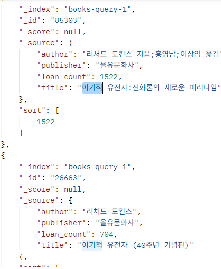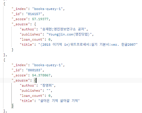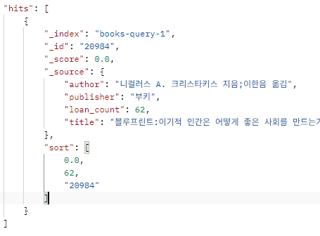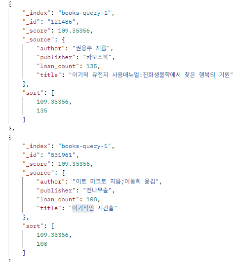 관련 없는 문서는 min_score로 제외를 했으니 이제 관련있는 문서들을 대출 수 순으로 보여줄 것이다.
