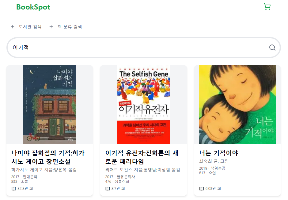 알라딘도 "이 기적", "기적"이 포함된 문장들이 검색된 것을 확인했다.