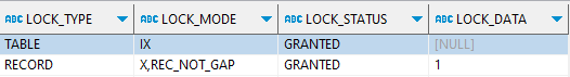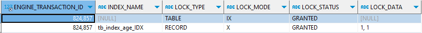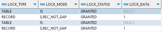 SELECT ENGINE_TRANSACTION_ID, INDEX_NAME, LOCK_TYPE, LOCK_MODE, LOCK_STATUS , LOCK_DATA FROM performance_schema.data_locks;