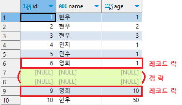 PK인 id를 기준으로 봤을 때 id 4~6 사이와 6~9 사이에 빈 공간이 있다.