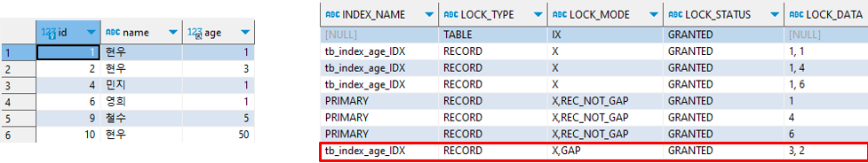 이는 age 인덱스에 age 값이 3으로 돼있는 id가 2인 레코드까지 갭락이 걸렸다는 것이다.