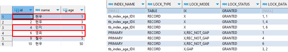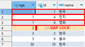 age가 1에 관련된 레코드가 모두 잠긴 것이다.
