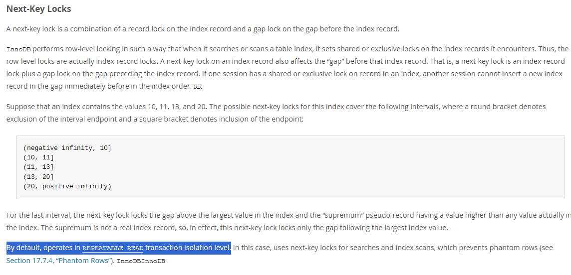 갭 락 자체가 REPEATABLE READ에서 동작하기 때문에 레코드 락과 갭 락을 같이 쓰는 넥스트 키 락도 REPEATABLE READ 수준에서 동작한다.