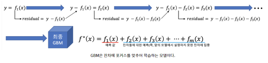 Gradient Boosting의 기본적인 아이디어는 주어진 데이터의 일부를 학습시켜 만든 모델로 다른 데이터를 예측한 후 알게되는 잔차를 이용하는 것이다. 이렇게 주어진 데이터에 대해 계속적으로 학습 후 모델을 만들고 다른 데이터를 예측함으로써 결국 잔차를 줄여나가보자는 아이디어에서 개발되었다.