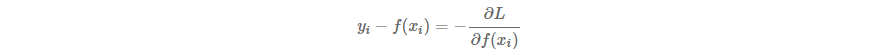 결국 좌변의 잔차(Residual)은 Loss function을 미분한 값에 음수를 붙인 Negative Gradient 값이 되게 된다. 그래서 잔차를 쓰되 잔차는 Gradient이기 때문에 모델의 이름이 GBM(Gradient Boosting Machine)이 된 것이다.