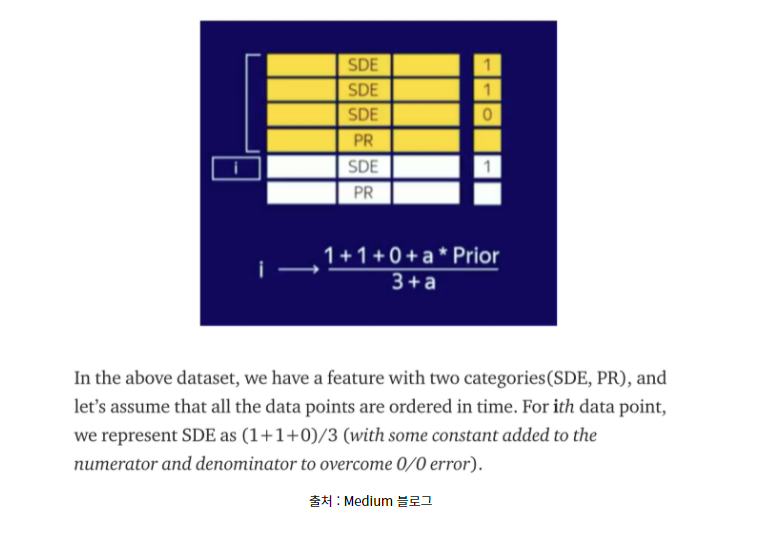 범주형 변수가 존재한다면 수치형 변수로 변환을 해주어야 한다. 이 때 CatBoost는 Response Encoding(=Mean Encoding = Target Encoding) 방법을 사용하게 된다. 해당 인코딩 방법에 대해서는 기존 블로그 글을 참고하자. 그런데 이 인코딩 방법을 사용할 때 주의해야 할 점이 있다. 평균(Mean)이라는 것을 사용하기 때문에 자칫하면 과거의 데이터를 인코딩 할 때 미래의 값을 사용하여 Data Leakage 문제를 일으킬 수 있다. 예를 들어, 학습 데이터의 범주형 변수를 변환시킬 때 검증(또는 테스트) 데이터의 범주형 변수를 활용한다는 것이다. 하지만 CatBoost는 2-2 목차에서 언급했던 것처럼 자체적으로 데이터셋에 시계열을 부여한다고 했다. 이러한 특성으로 인해 CatBoost 알고리즘 내부적으로 범주형 변수를 인코딩할 때 Data Leakage 문제를 일으키지 않도록 한다. 또한 다음과 같은 0으로 나누게 되는 수학적인 문제를 예방하기 위해서 분자, 분모에 매우 작은 스칼라값을 추가하는 라플라스 스무딩 기법을 사용하기도 한다.
