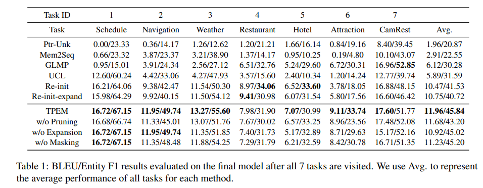 BLEU와 F1 score 모두 TPEM이 GLMP보다 훨씬 높았다. 또한 ablation experiment에서도 하나의 F1 score 빼고 모두 TPEM의 결과가 더 좋았다.
