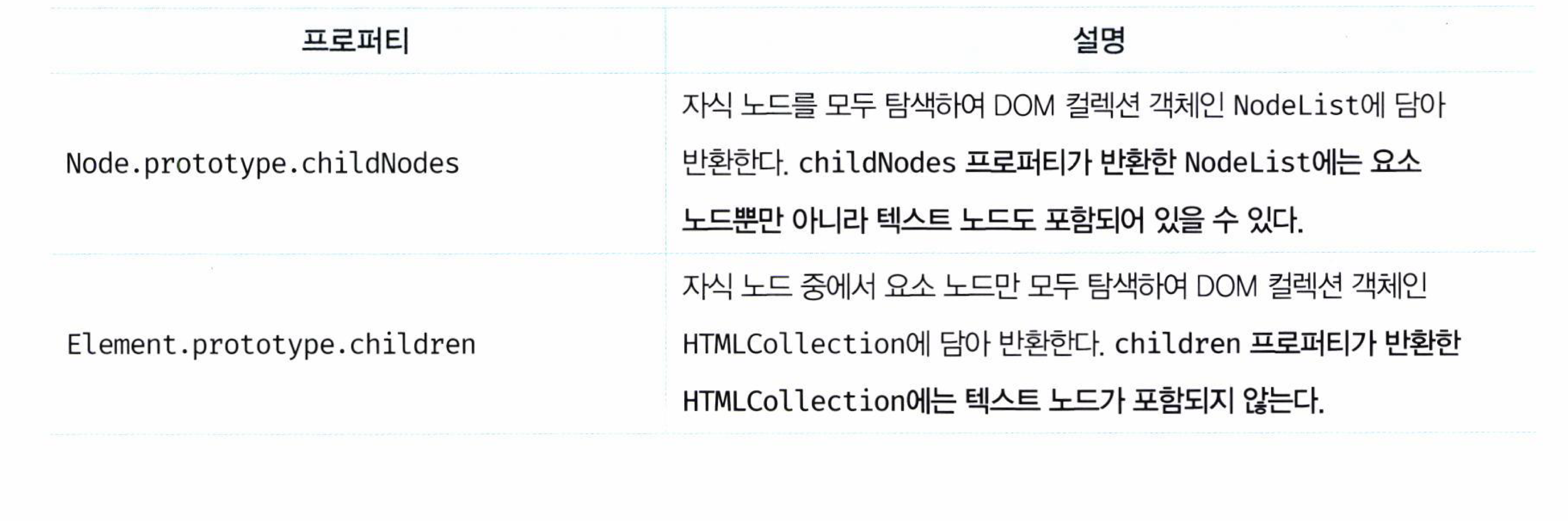 - 자식 노드 중에 텍스트 노드가 아닌 요소 노드가 존재하는지 확인하려면 children.length 또는 Element 인터페이스의 childElementCount 프로퍼티를 사용한다.