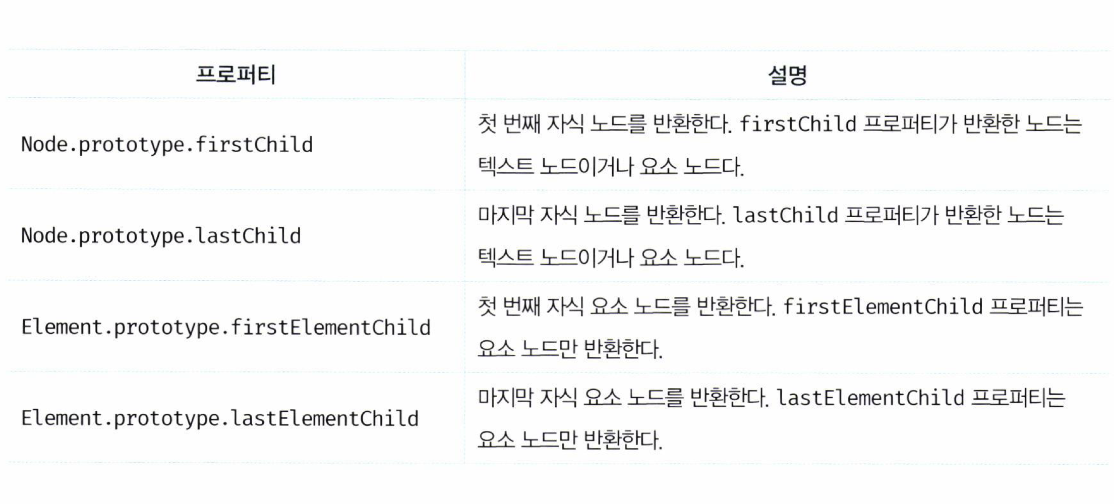 - Node.porotype.hasChildNodes : 자식 노드가 존재하는지 확인한다. 불리언 값을 반환한다. 리프 노드라면 텍스트 노드를 포함한다.