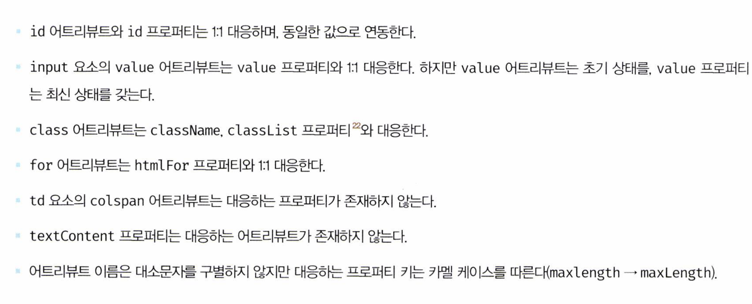 대부분의 HTML 어트리뷰트는 HTML 어트리뷰트 이름과 동일한 DOM 프로퍼티와 1:1로 대응하지만 언제나 1:1로 대응하는 것은 아니며 HTML 어트리뷰트 이름과 DOM 프로퍼티 키가 반드시 일치하는 것도 아니다.