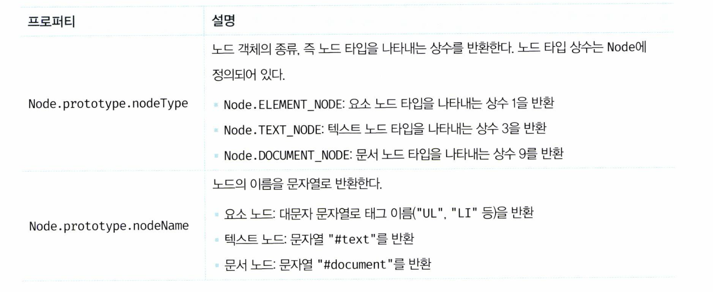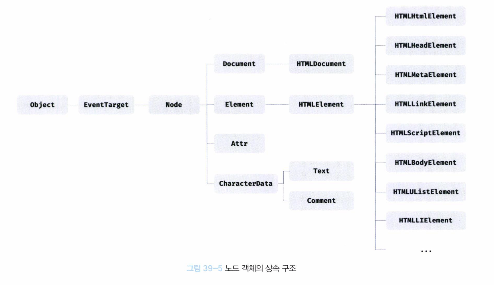 노드 객체는 공통 기능은 프로토타입 체인 상위에, 개별적인 고유 기능일수록 프로토타입 체인 하위에 프로토타입 체인 구축하여 상속 구조를 갖는다.