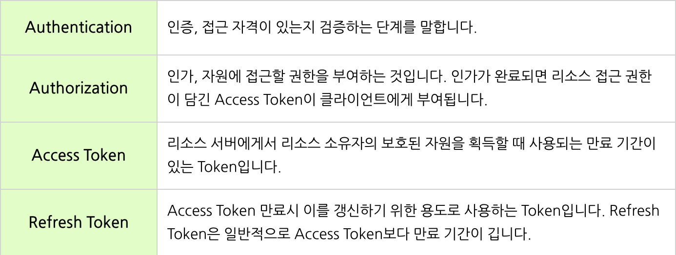 OAuth 주요 용어는 다음과 같다.